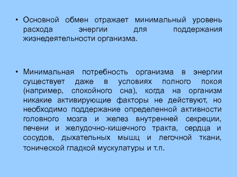 Минимальная потребность организма в энергии существует даже в условиях полного покоя (например, спокойного сна), когда на организм никакие активирующие факторы не действуют, но необходимо поддержание определенной активности головного мозга и желез внутренней секреции, печени и желудочно-кишечного тракта, сердца и сосудов, дыхательных мышц и легочной ткани, тонической гладкой мускулатуры и т.п.