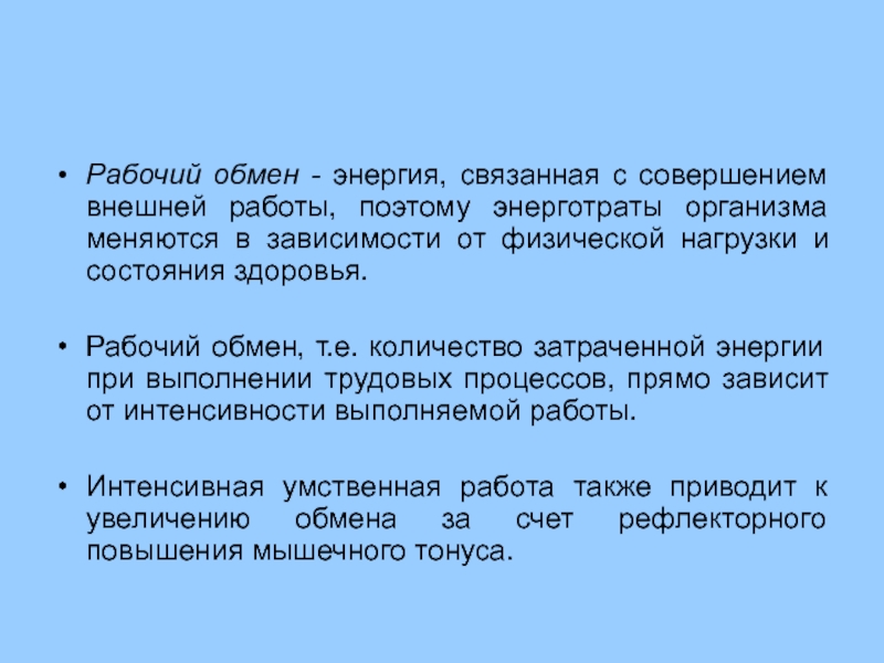 Энергетические затраты, идущие на поддержание жизни организма в покое, называются основным обменом, а энергетические затраты, идущие на процессы его жизнедеятельности (передвижение в пространстве, выполнение работы и т.д.), - рабочим обменом.