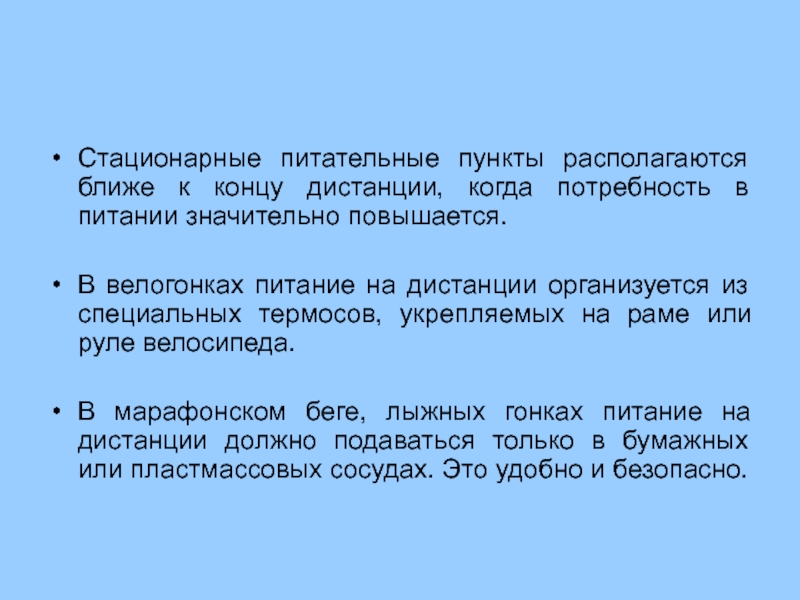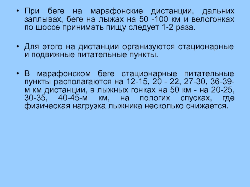 В марафонском беге стационарные питательные пункты располагаются на 12-15, 20 - 22, 27-30, 36-39-м км дистанции, в лыжных гонках на 50 км - на 20-25, 30-35, 40-45-м км, на пологих спусках, где физическая нагрузка лыжника несколько снижается.