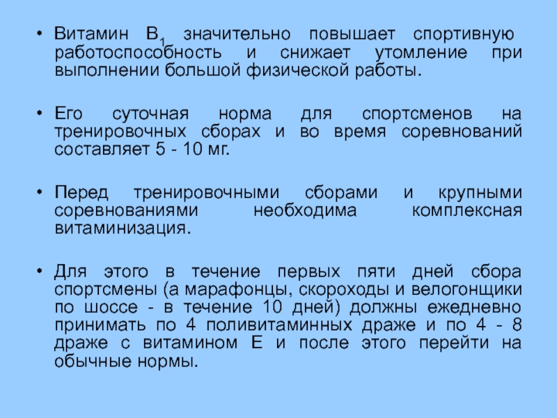 Витамин В1 значительно повышает спортивную работоспособность и снижает утомление при выполнении