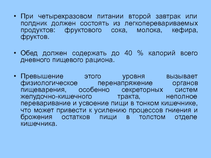 Если это время между завтраком и обедом, завтрак должен быть высококалорийным (30-35%), небольшим по объему, легкоусваиваемым, богатым сахаром, фосфором и витамином С и пищевыми веществами, повышающими функциональное состояние центральной нервной системы.