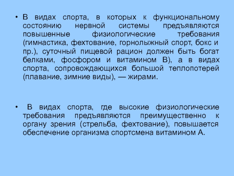 повышенные физиологические требования (гимнастика, фехтование, горнолыжный спорт, бокс и пр.), суточный пищевой рацион должен быть богат белками, фосфором и витамином В), а в видах спорта, сопровождающихся большой теплопотерей (плавание, зимние виды), — жирами.