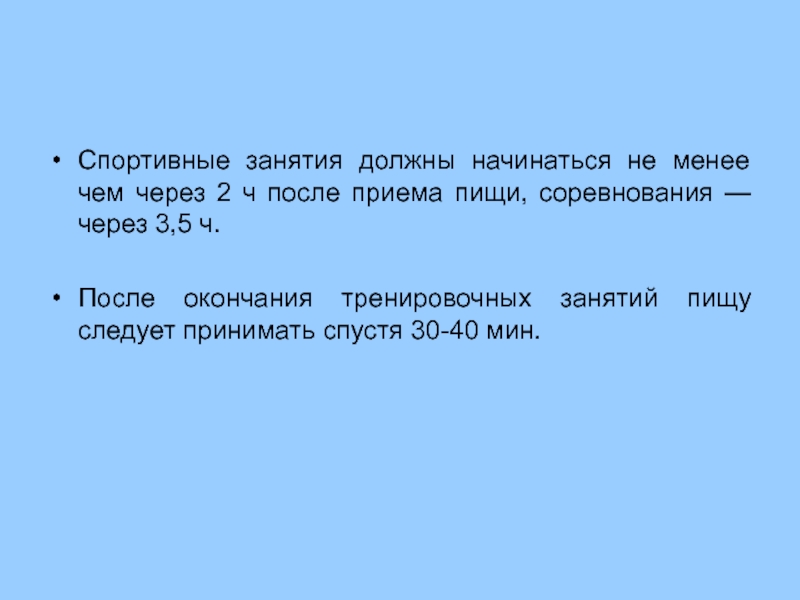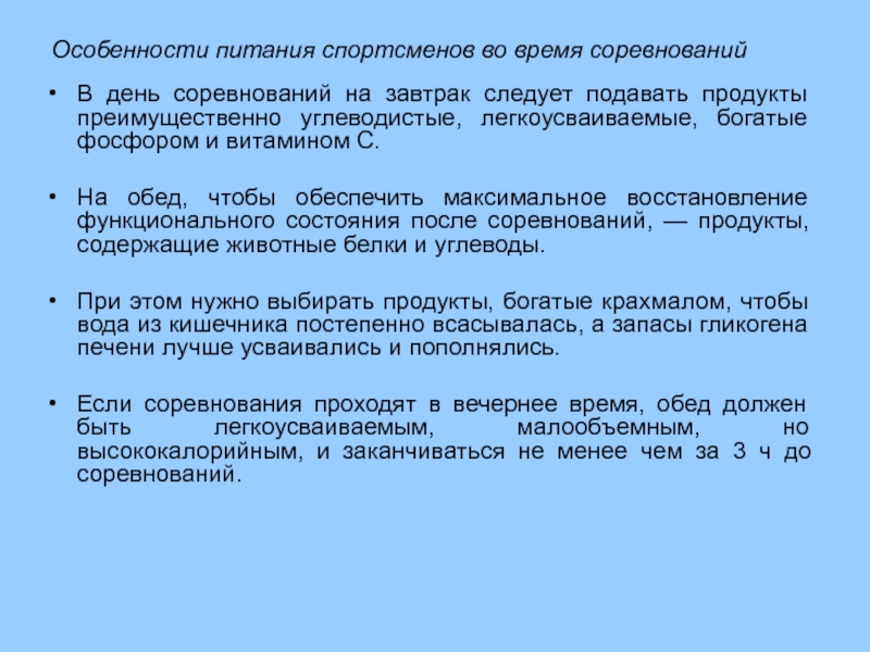 Если соревнования проходят в вечернее время, обед должен быть легкоусваиваемым, малообъемным, но высококалорийным, и заканчиваться не менее чем за 3 ч до соревнований.