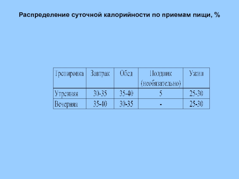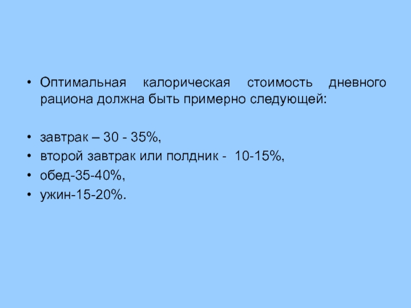Относительная калорийность обеда снижается до 30 - 35%, калорийность завтрака и ужина соответственно повышается.