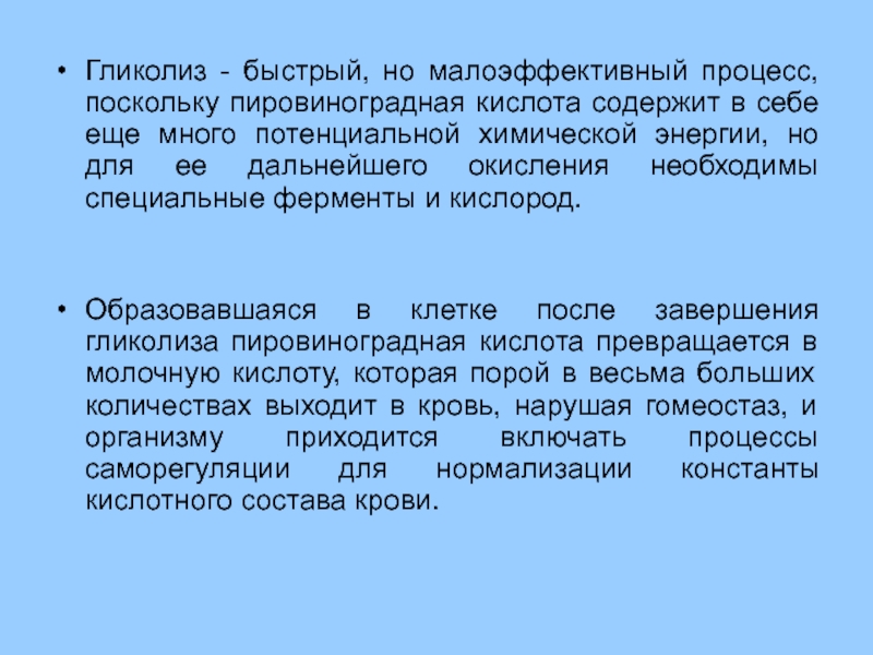Гликолиз - быстрый, но малоэффективный процесс, поскольку пировиноградная кислота содержит в