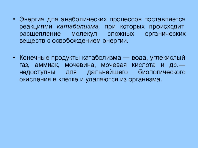 Конечные продукты катаболизма — вода, углекислый газ, аммиак, мочевина, мочевая кислота и др.— недоступны для дальнейшего биологического окисления в клетке и удаляются из организма.