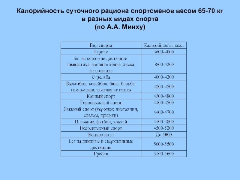 Слайд 71Калорийность суточного рациона спортсменов весом 65-70 кг в разных видах спорта
