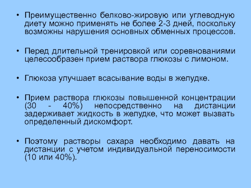 Поэтому питьевой режим спортсменов регламентируется, широко применяются жидкости, богатые солями, витаминами и органическими кислотами: фруктовые соки, вода, подкисленная лимонным соком с добавлением поваренной соли (4 - 7 г на 1 л воды).