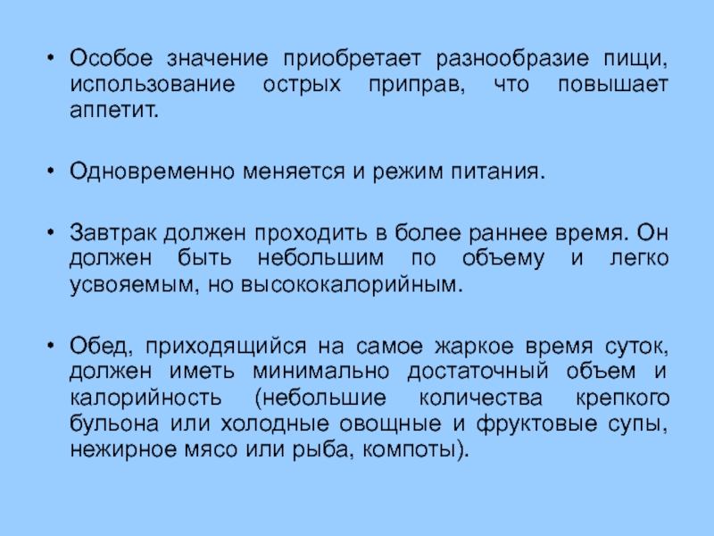 Особое значение приобретает разнообразие пищи, использование острых приправ, что повышает аппетит.