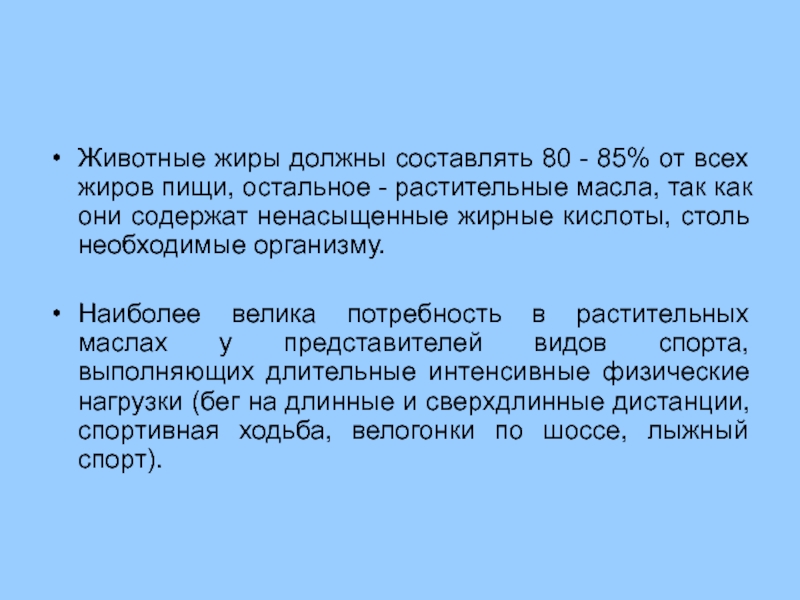 Соотношение белков, жиров и углеводов должно составлять 1:0,8:4 (или 5), а не 1:1:4, как в питании лиц, не занимающихся спортом.