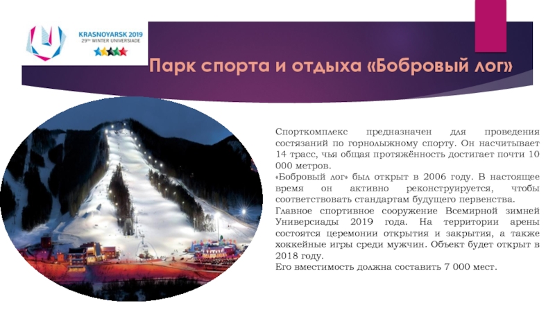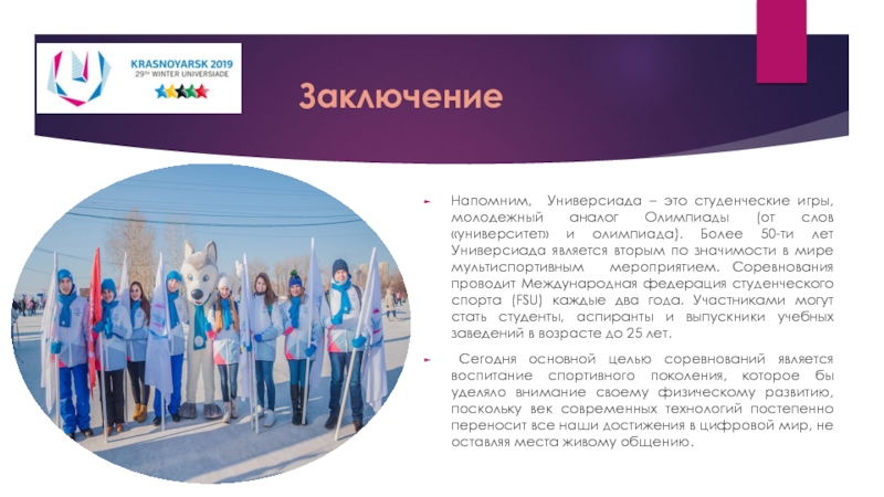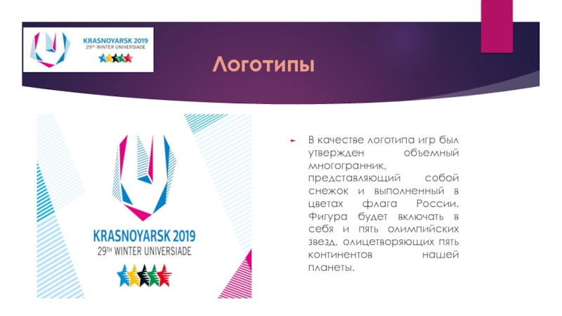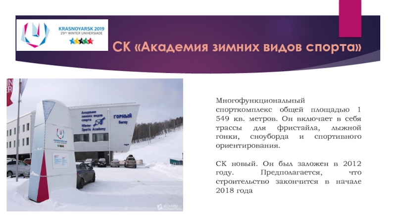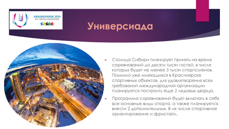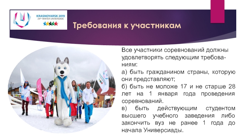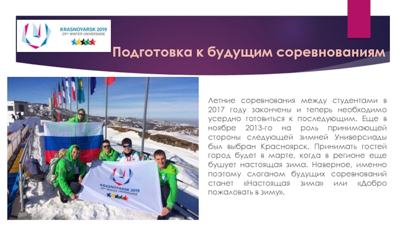 закончены и теперь необходимо усердно готовиться к последующим. Еще в ноябре 2013-го на роль принимающей стороны следующей зимней Универсиады был выбран Красноярск. Принимать гостей город будет в марте, когда в регионе еще бушует настоящая зима. Наверное, именно поэтому слоганом будущих соревнований станет «Настоящая зима» или «Добро пожаловать в зиму».