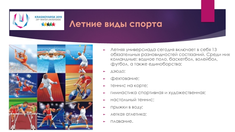 Летняя универсиада сегодня включает в себя 13 обязательных разновидностей