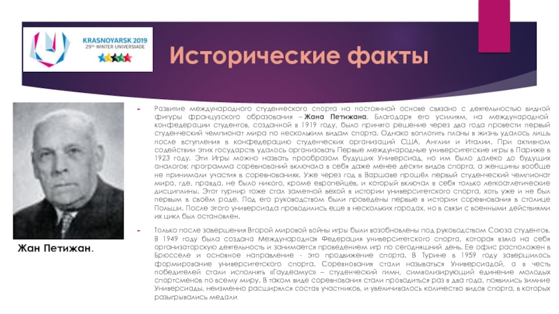 деятельностью видной фигуры французского образования – Жана Петижана. Благодаря его усилиям, на международной конфедерации студентов, созданной в 1919 году, было принято решение через два года провести первый студенческий чемпионат мира по нескольким видам спорта. Однако воплотить планы в жизнь удалось лишь после вступления в конфедерацию студенческих организаций США, Англии и Италии. При активном содействии этих государств удалось организовать Первые международные университетские игры в Париже в 1923 году. Эти Игры можно назвать прообразом будущих Универсиад, но им было далеко до будущих аналогов: программа соревнований включала в себя даже менее десяти видов спорта, а женщины вообще не принимали участия в соревнованиях. Уже через год в Варшаве прошёл первый студенческий чемпионат мира, где, правда, не было никого, кроме европейцев, и который включал в себя только легкоатлетические дисциплины. Этот турнир тоже стал заметной вехой в истории университетского спорта, хоть уже и не был первым в своём роде. Под его руководством были проведены первые в истории соревнования в столице Польши. После этого универсиада проводились еще в нескольких городах, но в связи с военными действиями их цикл был остановлен.