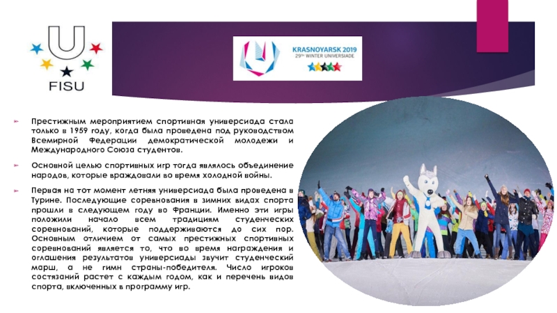 Слайд 6Престижным мероприятием спортивная универсиада стала только в 1959 году, когда была