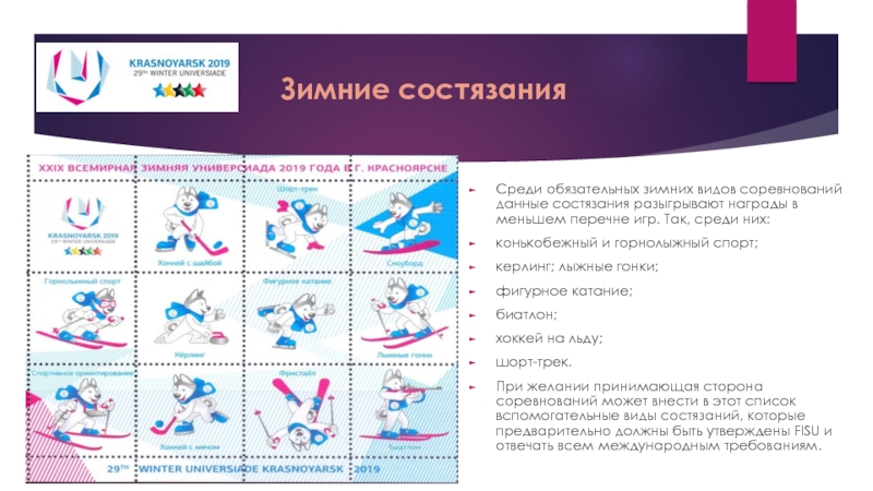 При желании принимающая сторона соревнований может внести в этот список вспомогательные виды состязаний, которые предварительно должны быть утверждены FISU и отвечать всем международным требованиям.