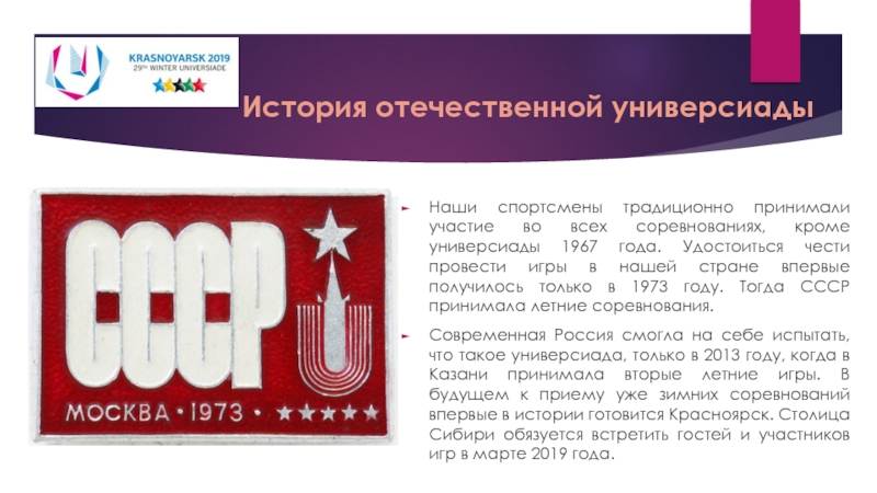 универсиады 1967 года. Удостоиться чести провести игры в нашей стране впервые получилось только в 1973 году. Тогда СССР принимала летние соревнования.