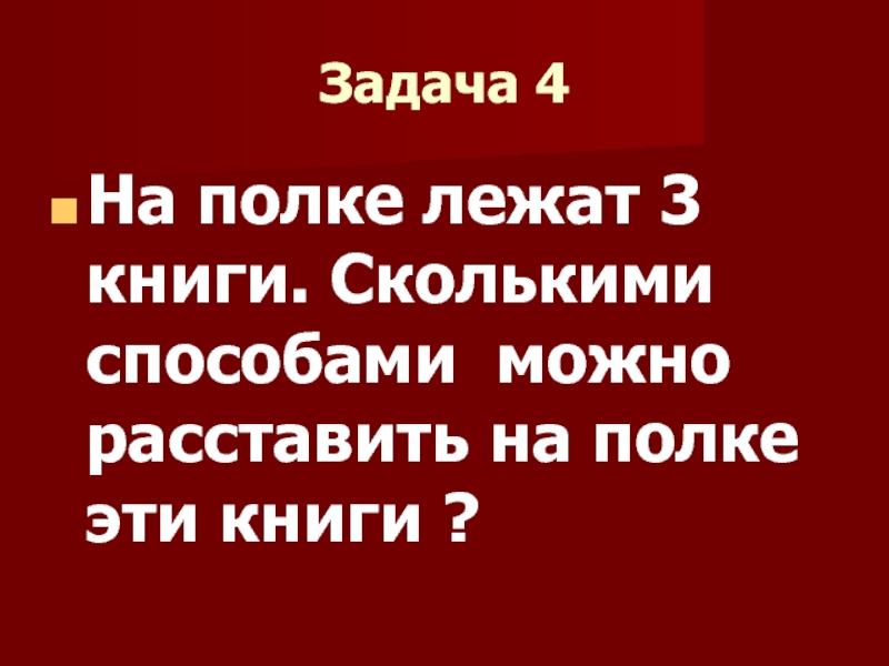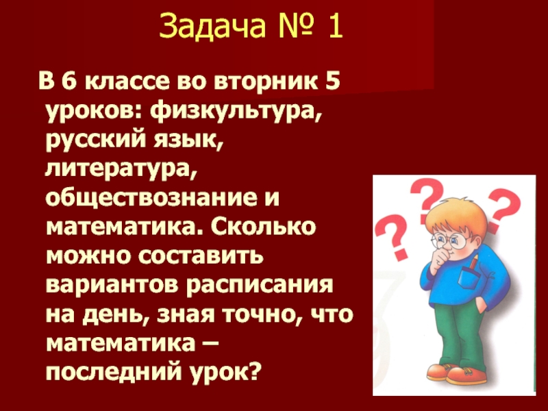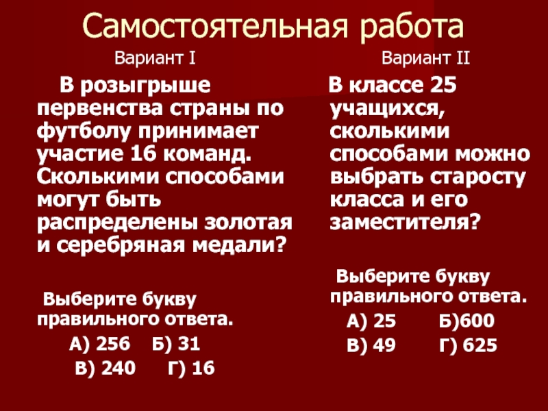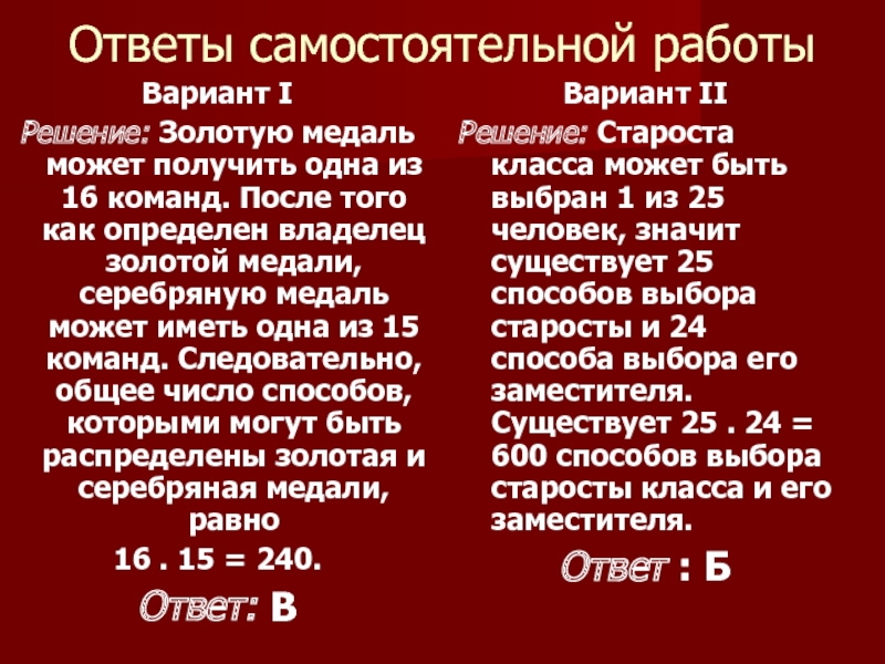 Решение: Староста класса может быть выбран 1 из 25 человек, значит существует 25 способов выбора старосты и 24 способа выбора его заместителя. Существует 25 . 24 = 600 способов выбора старосты класса и его заместителя.