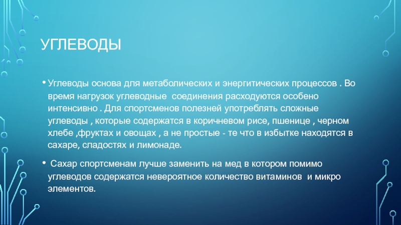 Углеводы основа для метаболических и энергитических процессов . Во время