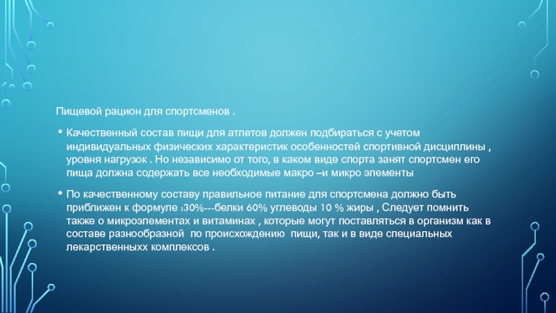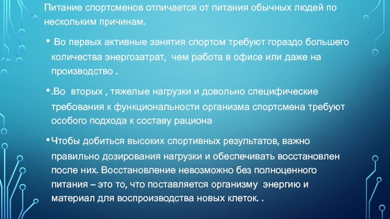Слайд 2Питание спортсменов отличается от питания обычных людей по нескольким причинам.
