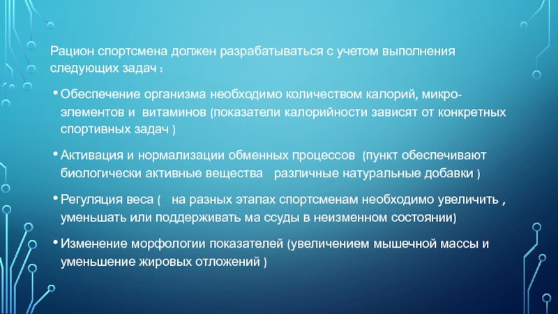 Слайд 3Рацион спортсмена должен разрабатываться с учетом выполнения следующих задач :
