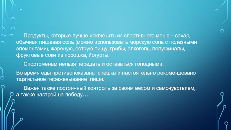 Слайд 10 Продукты, которые лучше исключить из спортивного меню –