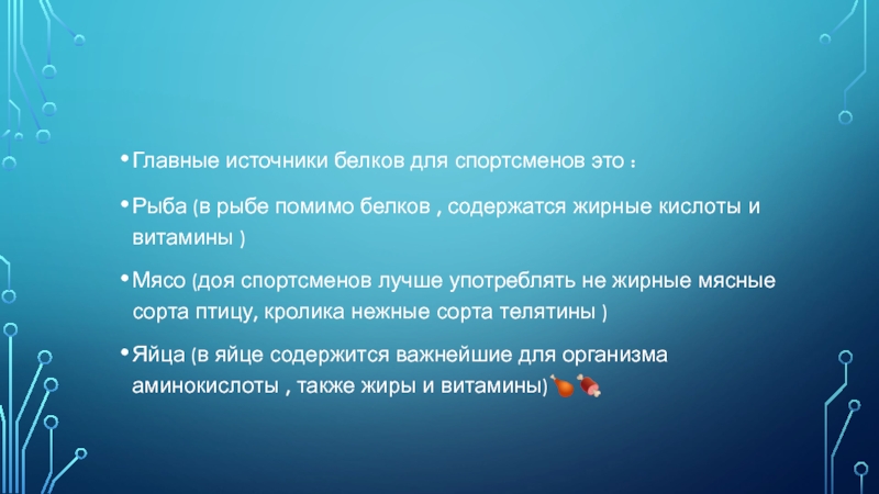 Мясо (доя спортсменов лучше употреблять не жирные мясные сорта птицу, кролика нежные сорта телятины )