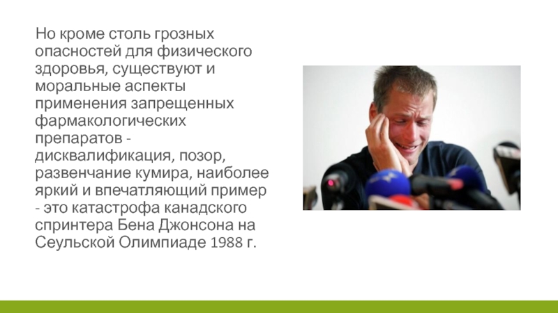 и моральные аспекты применения запрещенных фармакологических препаратов - дисквалификация, позор, развенчание кумира, наиболее яркий и впечатляющий пример - это катастрофа канадского спринтера Бена Джонсона на Сеульской Олимпиаде 1988 г.
