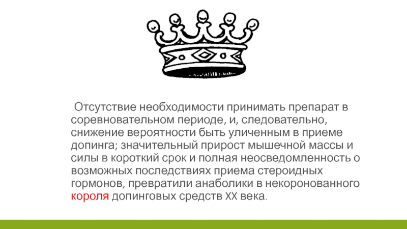 снижение вероятности быть уличенным в приеме допинга; значительный прирост мышечной массы и силы в короткий срок и полная неосведомленность о возможных последствиях приема стероидных гормонов, превратили анаболики в некоронованного короля допинговых средств XX века.