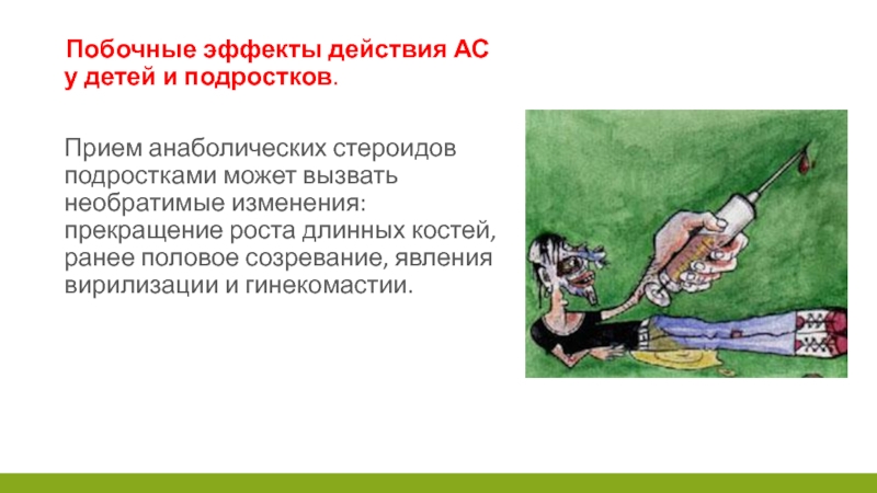 Слайд 22Побочное вредоносное действие анаболиков чрезвычайно разнообразно и опасно.