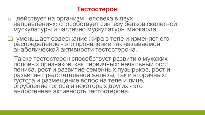 Также тестостерон способствует развитию мужских половых признаков, как первичных: начальный рост пениса, рост и развитие семенных пузырьков, рост и развитие предстательной железы; так и вторичных: густота и размещение волос на теле и лице, огрубление голоса и некоторых других - это андрогенная активность тестостерона.