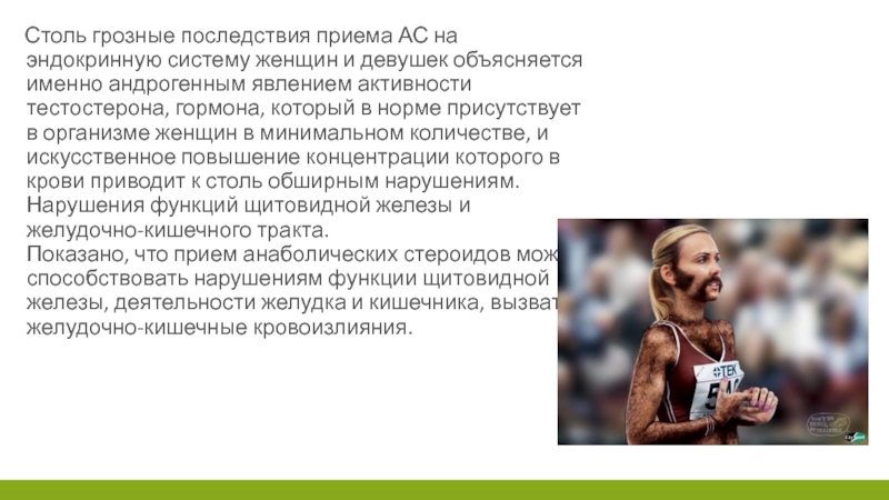 вызывает быстрое развитие явлений вирилизации: огрубление и понижение голоса, рост волос на подбородке и верхней губе, выпадение волос на голове по мужскому типу, уменьшение молочных желез, увеличение клитора, развитие общего гирсутизма (волосатости), атрофия матки, нарушения и прекращение менструального цикла (дисменорея и аменорея), акне, повышение секреции сальных желез, общая маскулинизация. Нарушения менструального цикла обратимы после отмены приема препаратов АС. Рост волос на лице, облысение, увеличение клитора и изменение голоса - необратимы. Особенно выражено вирилизующее действие АС у девушек и девочек; могут наблюдаться явления псевдогермафродитизма. У женщин прием АС может приводить к бесплодию, у беременных замедляется рост эмбриона и происходит гибель плода.