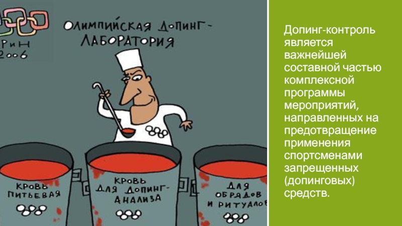 Слайд 38Допинг-контроль является важнейшей составной частью комплексной программы мероприятий, направленных на предотвращение