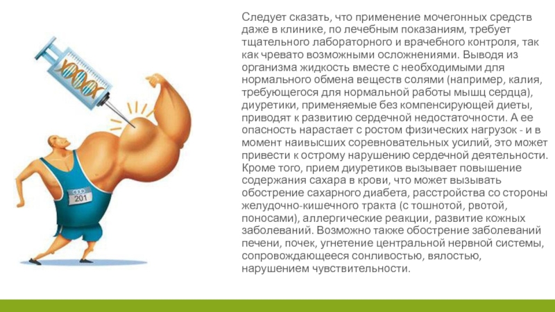 по лечебным показаниям, требует тщательного лабораторного и врачебного контроля, так как чревато возможными осложнениями. Выводя из организма жидкость вместе с необходимыми для нормального обмена веществ солями (например, калия, требующегося для нормальной работы мышц сердца), диуретики, применяемые без компенсирующей диеты, приводят к развитию сердечной недостаточности. А ее опасность нарастает с ростом физических нагрузок - и в момент наивысших соревновательных усилий, это может привести к острому нарушению сердечной деятельности. Кроме того, прием диуретиков вызывает повышение содержания сахара в крови, что может вызывать обострение сахарного диабета, расстройства со стороны желудочно-кишечного тракта (с тошнотой, рвотой, поносами), аллергические реакции, развитие кожных заболеваний. Возможно также обострение заболеваний печени, почек, угнетение центральной нервной системы, сопровождающееся сонливостью, вялостью, нарушением чувствительности.