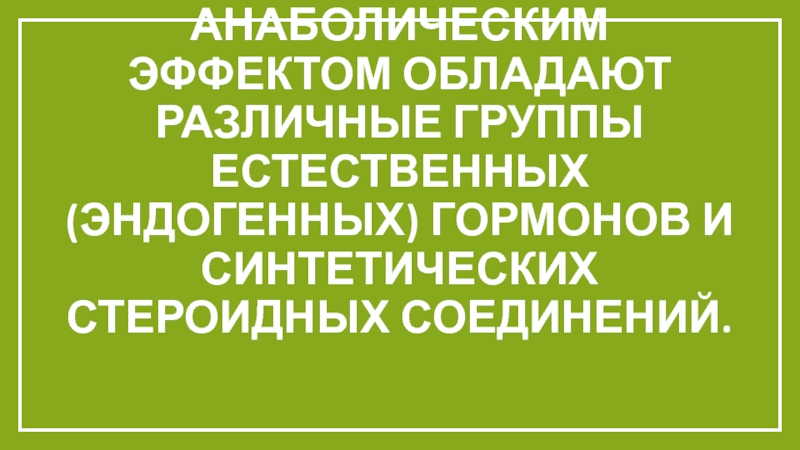 Слайд 20Анаболическим эффектом обладают различные группы естественных (эндогенных) гормонов и синтетических стероидных