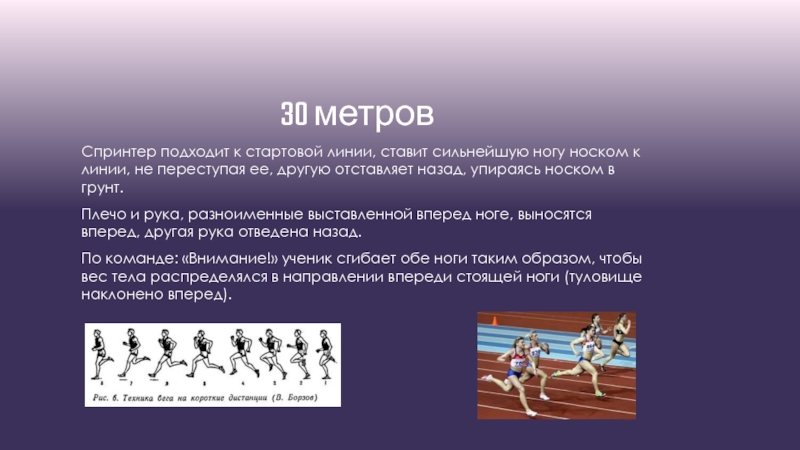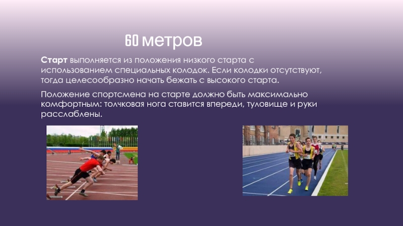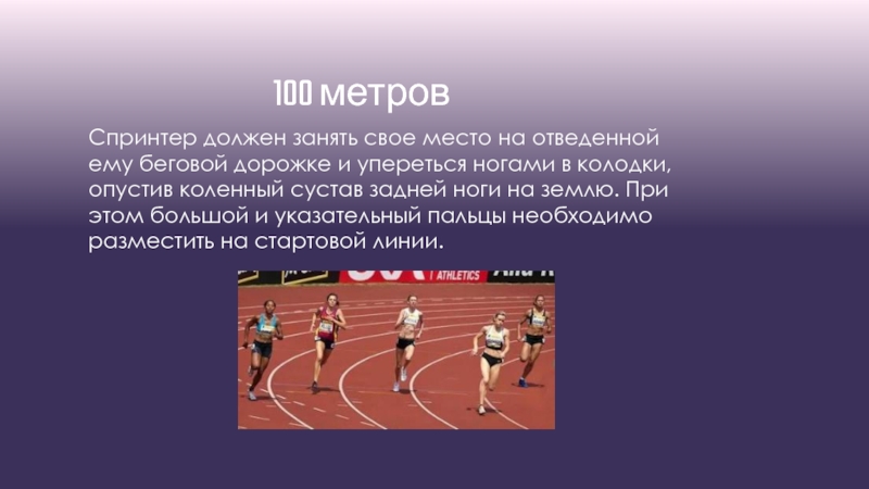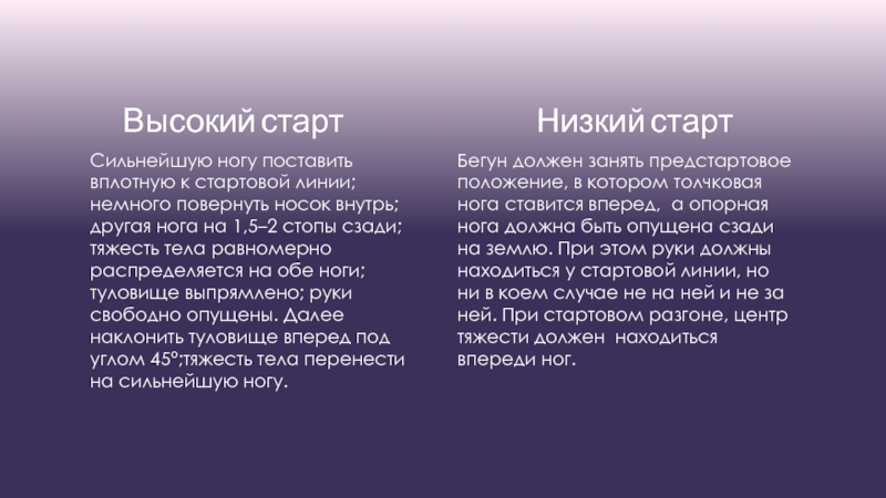 Бегун должен занять предстартовое положение, в котором толчковая нога ставится вперед, а опорная нога должна быть опущена сзади на землю. При этом руки должны находиться у стартовой линии, но ни в коем случае не на ней и не за ней. При стартовом разгоне, центр тяжести должен находиться впереди ног.