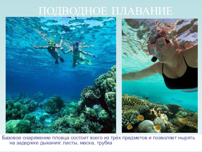 ПОДВОДНОЕ ПЛАВАНИЕБазовое снаряжение пловца состоит всего из трёх предметов и позволяет нырять на задержке дыхания: ласты, маска,
