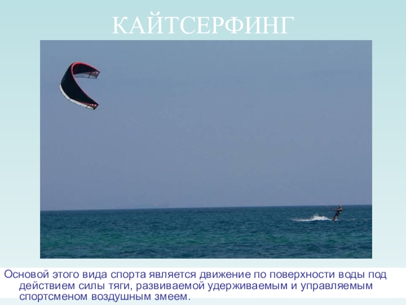 КАЙТСЕРФИНГОсновой этого вида спорта является движение по поверхности воды под действием силы тяги, развиваемой удерживаемым и управляемым