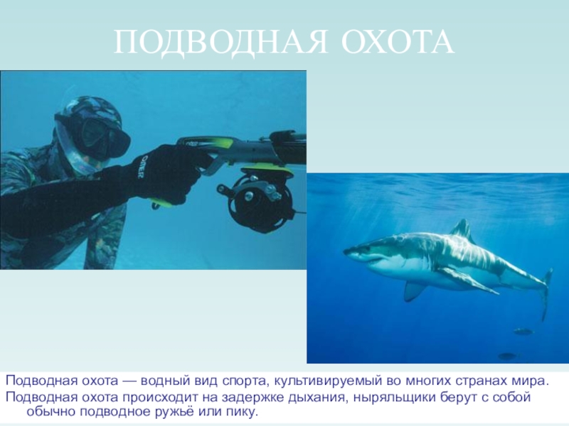 ПОДВОДНАЯ ОХОТАПодводная охота — водный вид спорта, культивируемый во многих странах мира. Подводная охота происходит на задержке
