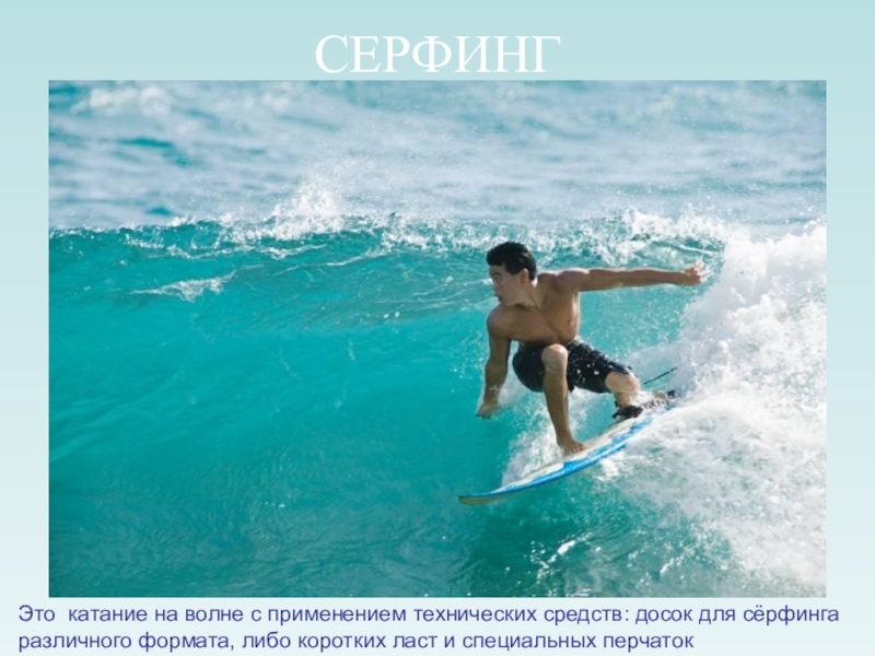 СЕРФИНГЭто катание на волне с применением технических средств: досок для сёрфинга различного формата, либо коротких ласт и специальных перчаток