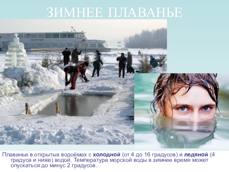 ЗИМНЕЕ ПЛАВАНЬЕПлаванье в открытых водоёмах с холодной (от 4 до 16 градусов) и ледяной (4 градуса и