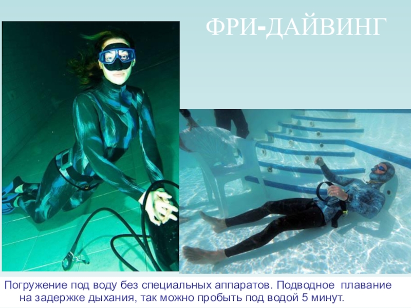 ФРИ-ДАЙВИНГПогружение под воду без специальных аппаратов. Подводное плавание на задержке дыхания, так можно пробыть под водой 5