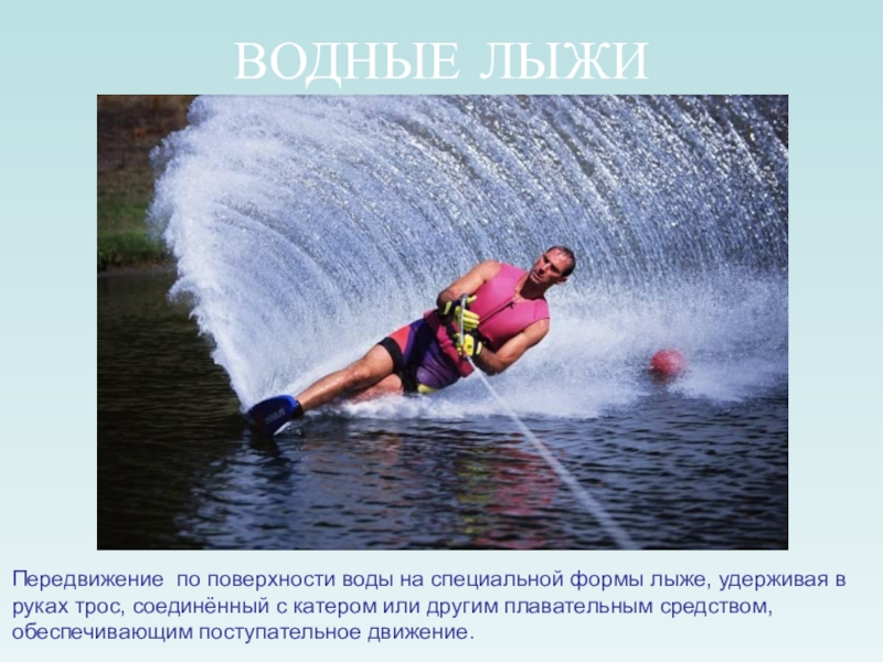 ВОДНЫЕ ЛЫЖИПередвижение по поверхности воды на специальной формы лыже, удерживая в руках трос, соединённый с катером или
