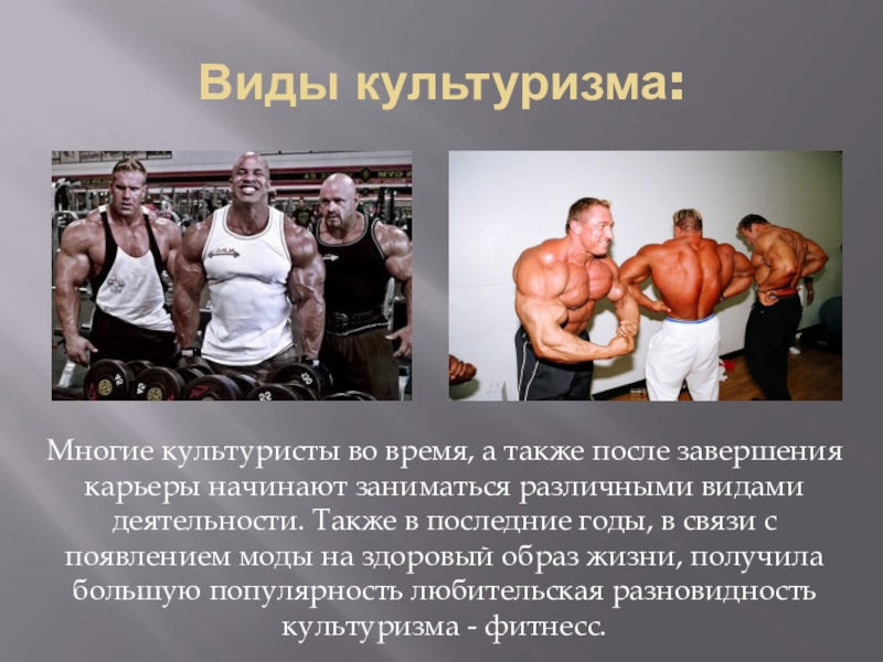 заниматься различными видами деятельности. Также в последние годы, в связи с появлением моды на здоровый образ жизни, получила большую популярность любительская разновидность культуризма - фитнесс.