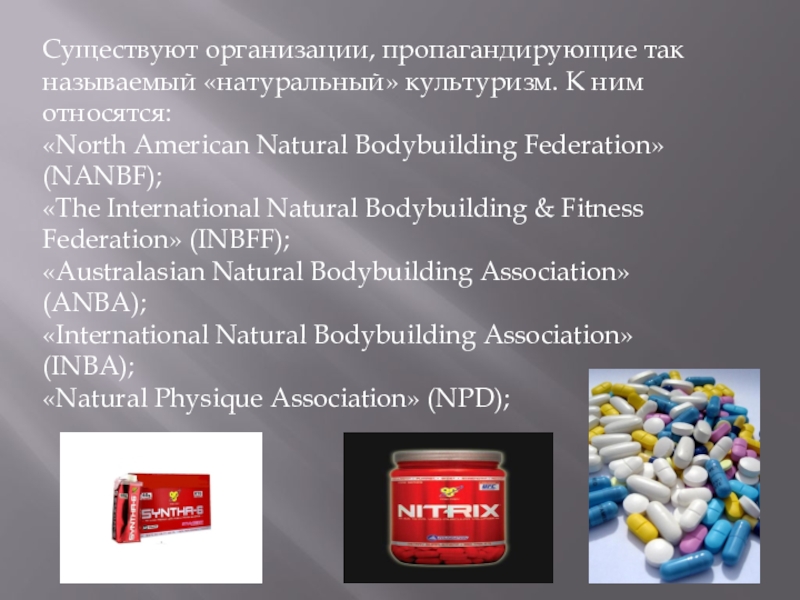 Слайд 12Существуют организации, пропагандирующие так называемый «натуральный» культуризм. К ним относятся: