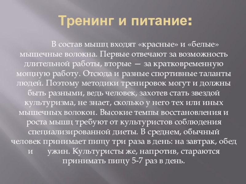 входят «красные» и «белые» мышечные волокна. Первые отвечают за возможность длительной работы, вторые — за кратковременную мощную работу. Отсюда и разные спортивные таланты людей. Поэтому методики тренировок могут и должны быть разными, ведь человек, захотев стать звездой культуризма, не знает, сколько у него тех или иных мышечных волокон. Высокие темпы восстановления и роста мышц требуют от культуристов соблюдения специализированной диеты. В среднем, обычный человек принимает пищу три раза в день: на завтрак, обед и ужин. Культуристы же, напротив, стараются принимать пищу 5-7 раз в день.