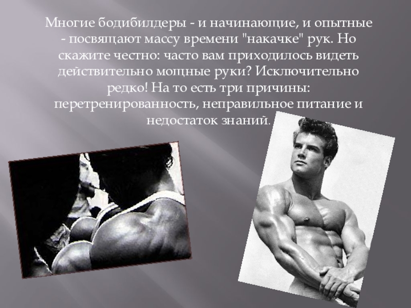 "накачке" рук. Но скажите честно: часто вам приходилось видеть действительно мощные руки? Исключительно редко! На то есть три причины: перетренированность, неправильное питание и недостаток знаний.