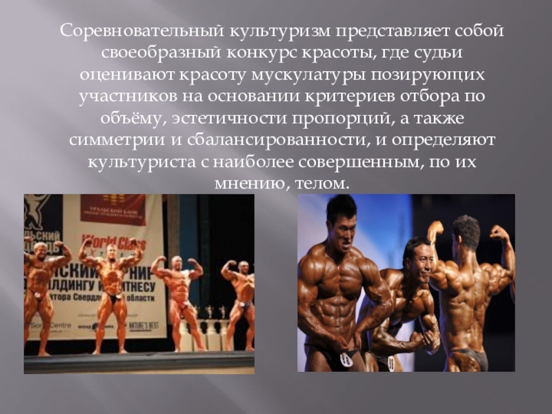 Слайд 9Соревновательный культуризм представляет собой своеобразный конкурс красоты, где судьи оценивают красоту мускулатуры