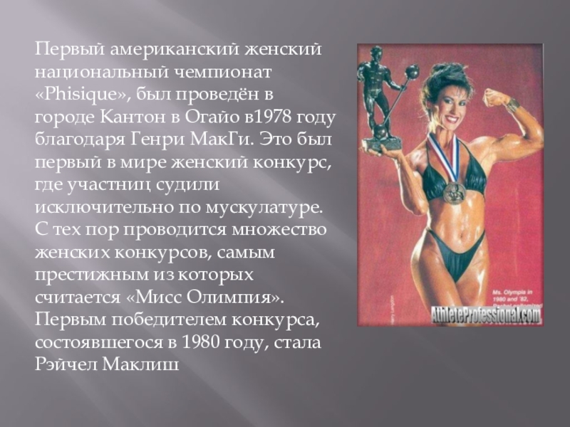 в Огайо в1978 году благодаря Генри МакГи. Это был первый в мире женский конкурс, где участниц судили исключительно по мускулатуре. С тех пор проводится множество женских конкурсов, самым престижным из которых считается «Мисс Олимпия». Первым победителем конкурса, состоявшегося в 1980 году, стала Рэйчел Маклиш