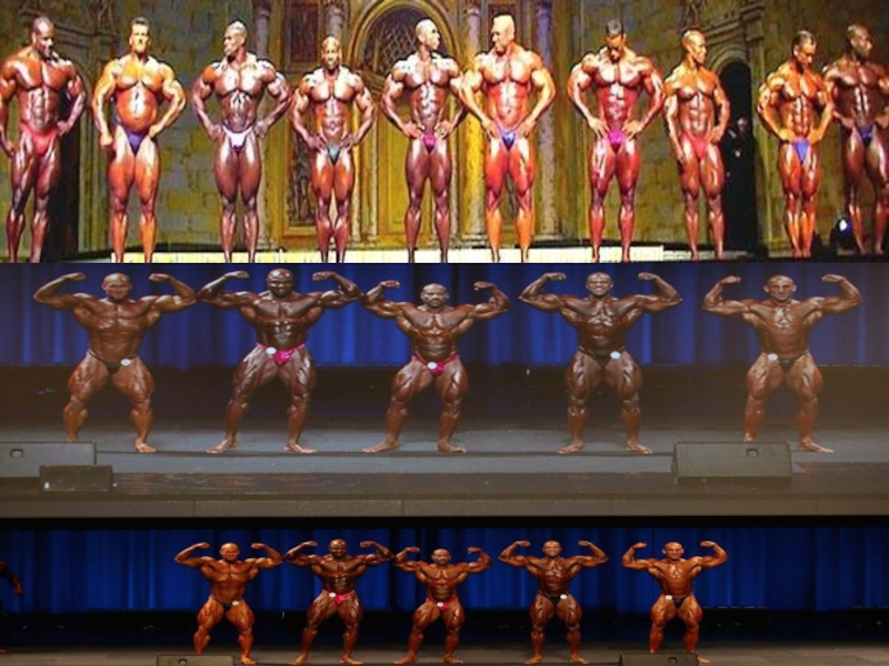 позирующих участников на основании критериев отбора по объёму, эстетичности пропорций, а также симметрии и сбалансированности, и определяют культуриста с наиболее совершенным, по их мнению, телом.