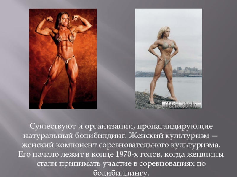 Слайд 8Существуют и организации, пропагандирующие натуральный бодибилдинг. Женский культуризм — женский компонент соревновательного